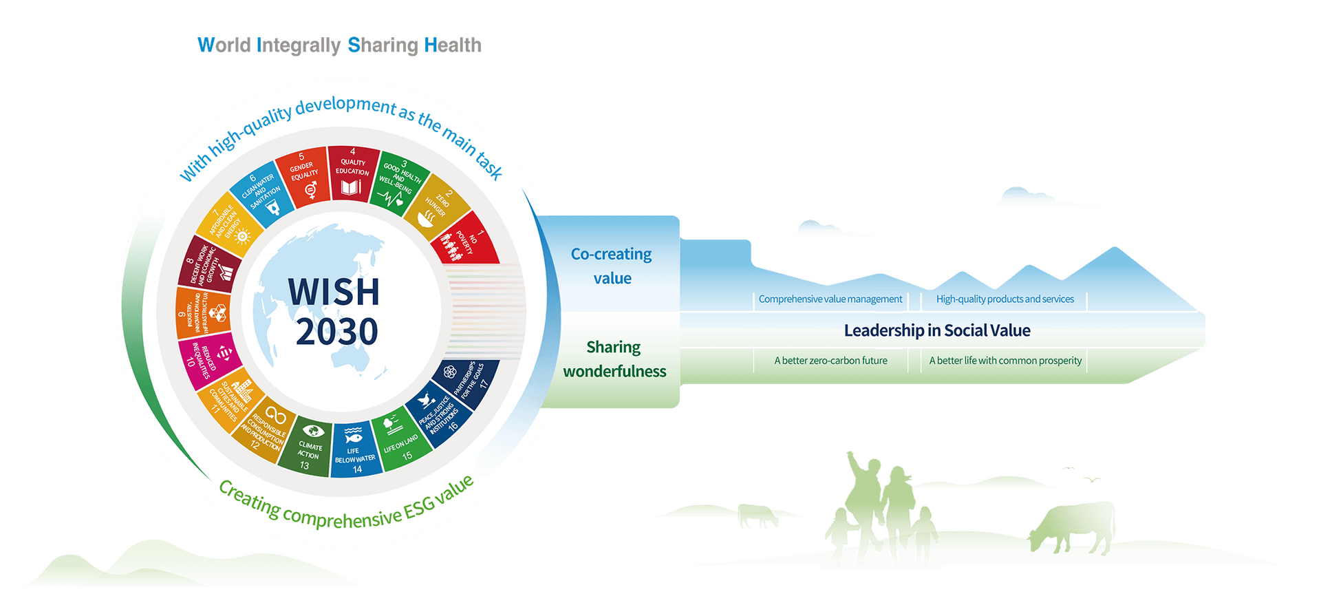 As a dairy company, our business originates from nature. We believe that our path to sustainability lies in determining how to reciprocate the benefits we've received from nature and contribute to a better world. Therefore, we not only focuses on providing healthy and nutritious products for our consumers, but also commits to contributing to a better future for our society and environment. Sustainable development is the "golden key" to solving current global issues. In 2022, Yili has upgraded the WISH system to the "WISH 2030" golden key sustainable development framework and committed to fully implementing the UN Sustainable Development Goals (SDGs) by 2030 in pursuit of the goal "World Integrally Sharing Health".
