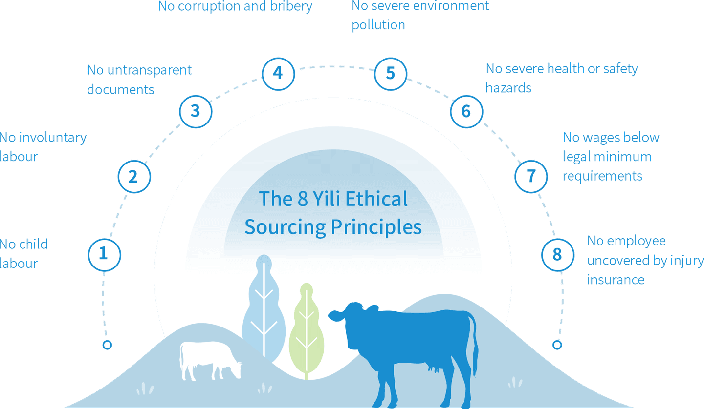 As a company that has grown up in China and operates globally, Yili is continuously striving to create value for our consumers, shareholders, and business partners, while also considering how to make our business become more sustainable. We have the highest quality requirements for the products and services provided by our suppliers, and we also hope that our procurement activities can bring greater value to society. Our suppliers should provide a healthy, safe and ethical working environment for their employees and respect them as we do. These will all become the important conditions that help Yili's growth and high-quality development. Therefore, we are willing to cooperate with suppliers who share the same principles and values, and who have a common vision and aspirations with us.