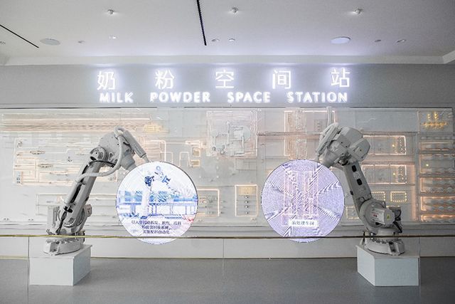 奶粉全球智造标杆基地拥有多种全球领先的交互技术,以“探寻母爱宝藏”故事线为引导,通过生物智能识别技术触发屏幕上的飞行器,观众将开启奶粉基地的参观。首先看到的是奶粉空间站,这里着重运用了数字化技术,以电子沙盘形式呈现了工厂的整体布局规划,展示了预处理、配料、混料、浓缩、干燥等设备模型,是国内首次采用智能机械臂的方式解密工厂布局,通过机械臂的动态演绎,屏幕上呈现出各工段的生产亮点,使我们更加清晰、全面地了解澳门新葡电子游戏网对奶粉品质把控。