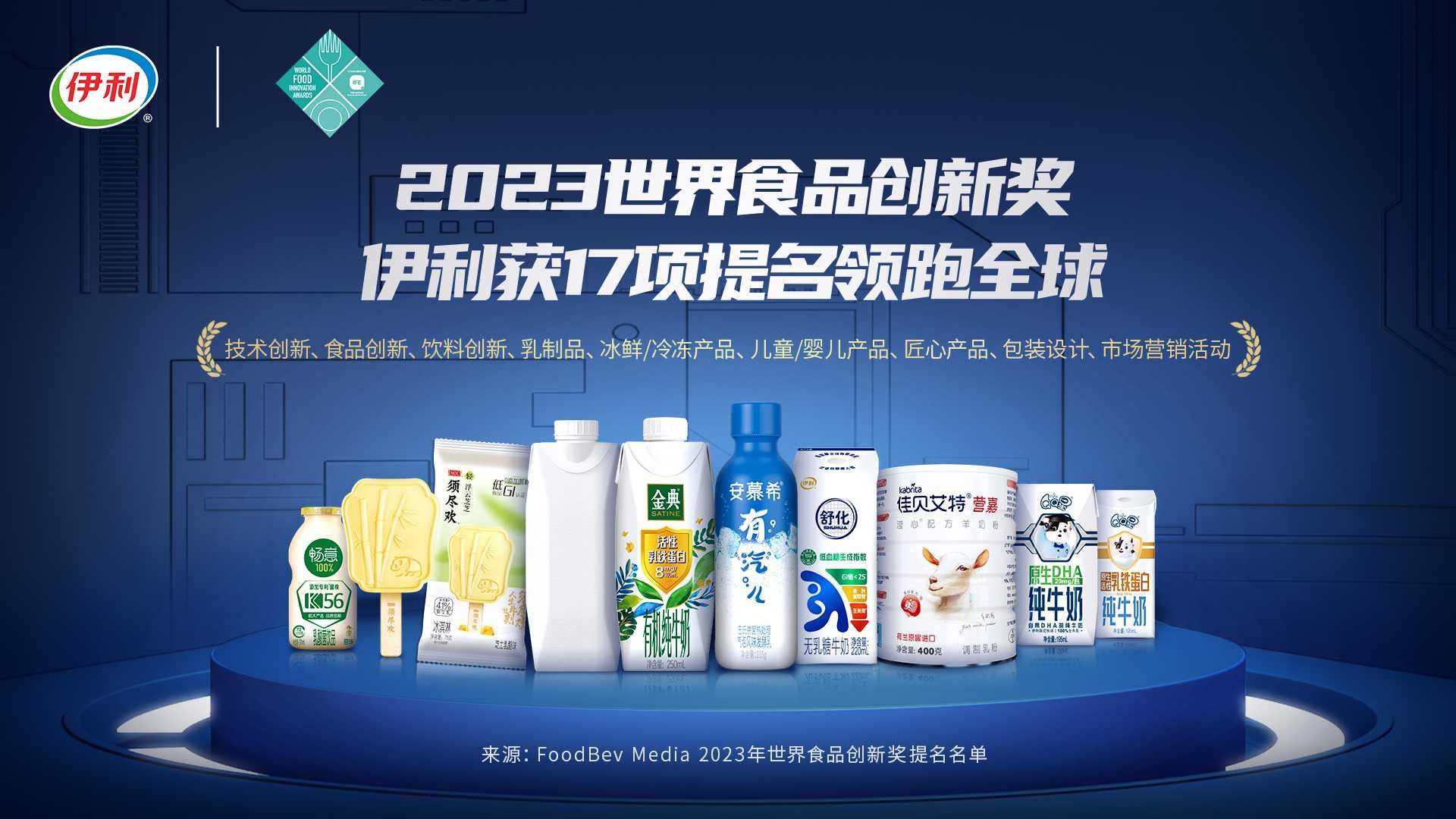 榜单显示,安慕希有汽儿酸奶,荣获食品创新奖提名;安慕希有汽儿酸奶、舒化控糖牛奶、QQ星原生DHA纯牛奶、佳贝艾特营嘉滢心配方羊奶粉,荣获乳制品创新奖提名;QQ星原生活性乳铁蛋白纯牛奶和舒化控糖牛奶,荣获技术创新奖提名;QQ星原生活性乳铁蛋白纯牛奶,荣获儿童/婴儿产品创新奖提名;畅意100%乳酸菌饮品,荣获饮品创新奖提名;须尽欢芝士乳酪味冰淇淋,荣获冰鲜/冷冻产品创新奖提名;金典活性乳铁蛋白有机纯牛奶、QQ星原生活性乳铁蛋白纯牛奶、QQ星原生DHA纯牛奶,荣获匠心产品奖提名;金典无印刷无油墨环保包装,荣获包装设计创新奖提名;安慕希地域限定助力乡村振兴、安慕希公益环保活动、安慕希虎起中国范春节营销活动,荣获营销活动创新奖提名。