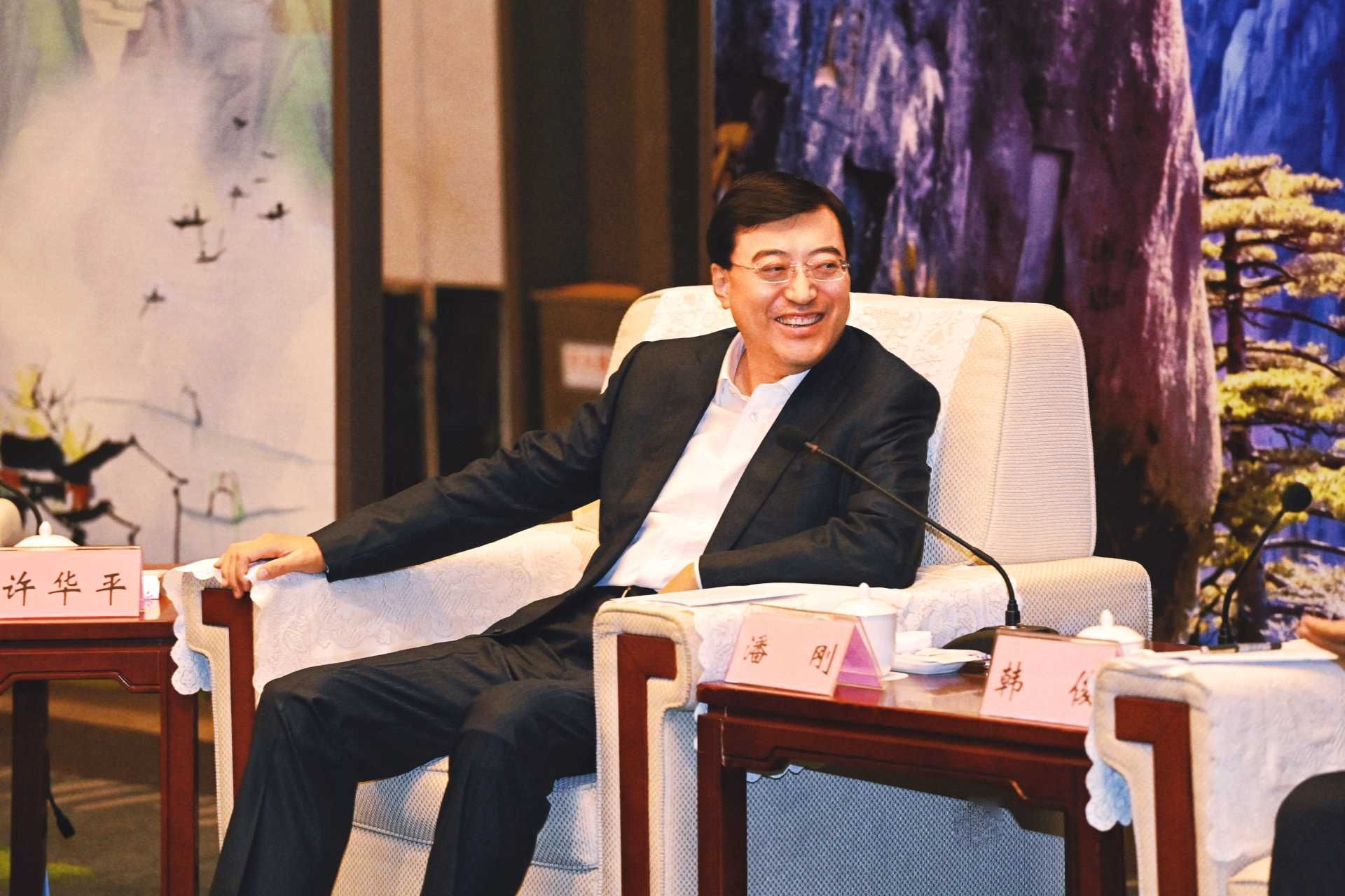 安徽省委书记韩俊、省长王清宪与潘刚率领的中国青年企业家协会代表团举行工作会谈(图片来源:安徽新闻联播)