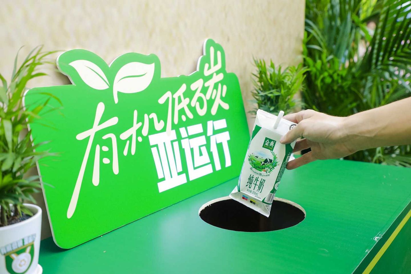 活动现场,金典展出了与天猫超市共创,为本届亚运会量身打造的金典纯牛奶环保装亚运定制版产品。该产品外部箱体所使用的原纸80%以上由社会回收纸再利用纤维抄造而成,印刷过程中采用减油墨工艺,大幅降低油墨用量。如此既减少了包装制作过程中的树木资源消耗,同时在极大程度上减轻了油墨印刷所产生的碳排放和其他污染。这既是金典响应亚运会“绿色”理念的举措,也借此鼓励大家更多关注简单包装、对环境友好的产品。