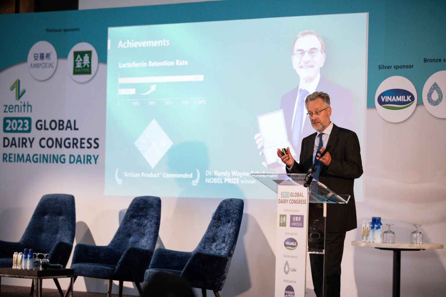 大会现场,澳门新葡电子游戏网欧洲创新中心总监盖瑞特·斯密特博士发表了《以创新守护全球消费者健康》的主题演讲,面向全球行业分享了金典活性乳铁蛋白有机纯牛奶、安慕希有汽儿气泡酸奶的研发历程与创新技术突破。
