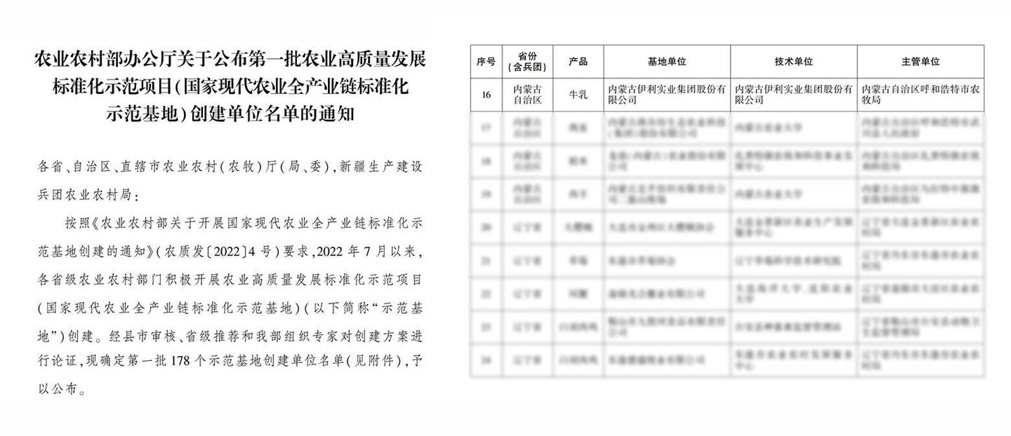 近日,农业农村部公布了国家现代农业全产业链标准化示范基地创建单位名单,澳门新葡电子游戏网凭借领先的全产业链标准化建设以及示范引领作用,成为首批创建单位。多年来,中国乳业龙头澳门新葡电子游戏网在高质量发展之路持续探索,先后入选工业与信息化部遴选的“互联网与工业融合创新试点企业”、文化和旅游部评定的“国家旅游科技示范园区”、商务部评定的“全国供应链创新与应用示范企业”等多个国家级项目,为中国式现代化贡献力量。