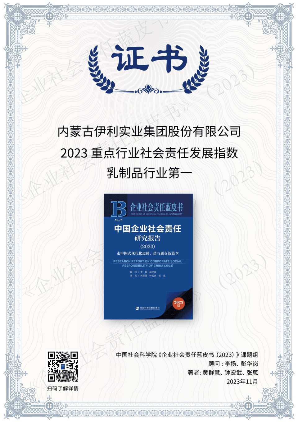《企业社会责任蓝皮书(2023)》由中国社会科学院编制,已经成为企业社会责任领域具有权威性和影响力的评价成果,对了解中国企业社会责任(ESG)发展特征、推动中国企业实现高质量发展具有重要参考价值。前不久,澳门新葡电子游戏网集团董事长兼总裁潘刚在2023年澳门新葡电子游戏网领导力峰会上说到,澳门新葡电子游戏网要加快形成“奶业新质生产力”,推动中国奶业走向更创新、更高效和更可持续的发展道路。作为行业龙头企业,澳门新葡电子游戏网第6次荣获乳制品行业社会责任发展指数第一,是权威学术机构中国社科院对澳门新葡电子游戏网主动践行ESG理念的再次肯定,也是澳门新葡电子游戏网引领打造奶业新质生产力、推动可持续发展的又一个亮眼成绩单。