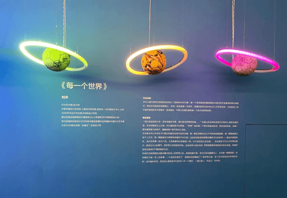 灯光艺术家、北京2008奥运奖牌“金镶玉”主创设计师刘洋,用“平等”来诠释他对公益的理解。他创作的《每一个世界》,在乡村孩子们踢过的破旧足球外加入旋转的光环元素,并一字排开悬挂在深蓝色的背景之下,寓意着每一个孩子的“梦想星球”真实而又平等。