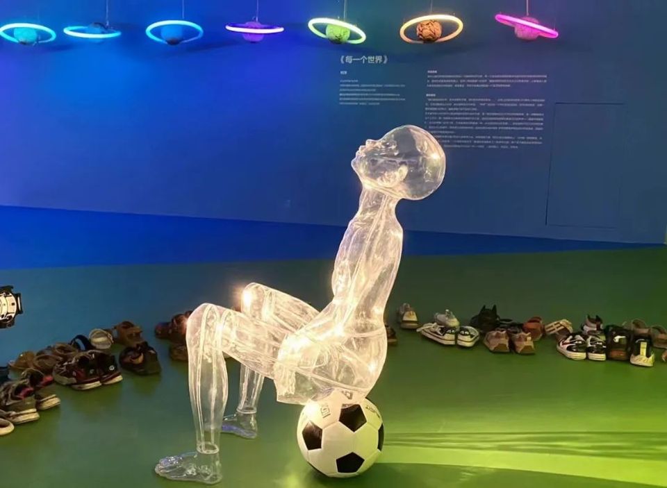 雕塑艺术家、中国雕塑家协会会员刘宝亮作品的关键词则是“看见”。他为这次展览创作的作品《若有若无》,主体是一个坐在足球上的透明的少年,周围散落着从乡村收集来的,孩子们穿过的破旧球鞋。刘宝亮希望大家能通过孩子透明的身体,看见孩子的未来梦想。