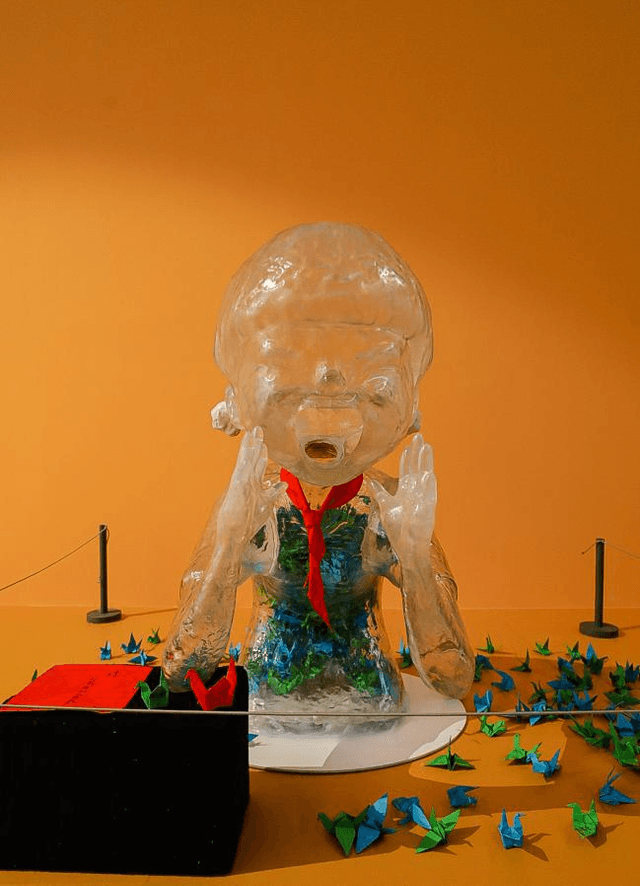 世界动画协会中国分会成员何文文,用“纯粹”来诠释他的作品。他在透明状的儿童雕塑中嵌入了来自山里孩子们的上百个愿望的千纸鹤。何文文认为,这些孩子的愿望简单而纯粹,希望能通过这件作品将孩子们的愿望传递给大众。