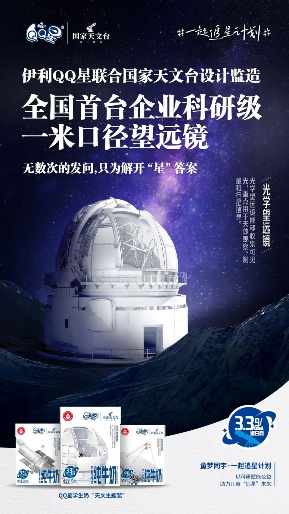 此次“一起追星计划”投建的“大视场巡天望远镜”将能够帮助热爱天文科学的孩子们更清晰地观测天体和科学地分析天体运行规律,更好地满足他们对浩瀚宇宙的好奇心和求知欲,助力孩子们天文梦想的实现。同时,为了把天文知识带给更广泛的青少年群体,澳门新葡电子游戏网QQ星品牌为“一起追星计划”特别设计了天文科普概念版学生奶。通过在瓶身上印制经过科学审定的天文知识,让更多青少年在饮用牛奶的同时获得知识和营养的双倍支持。