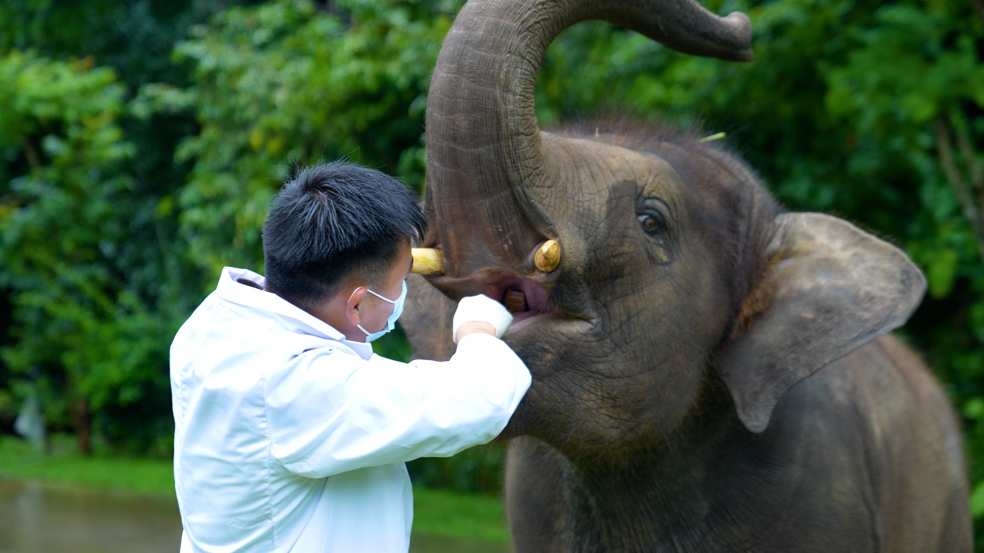 “大象医生”为救助象检查口腔